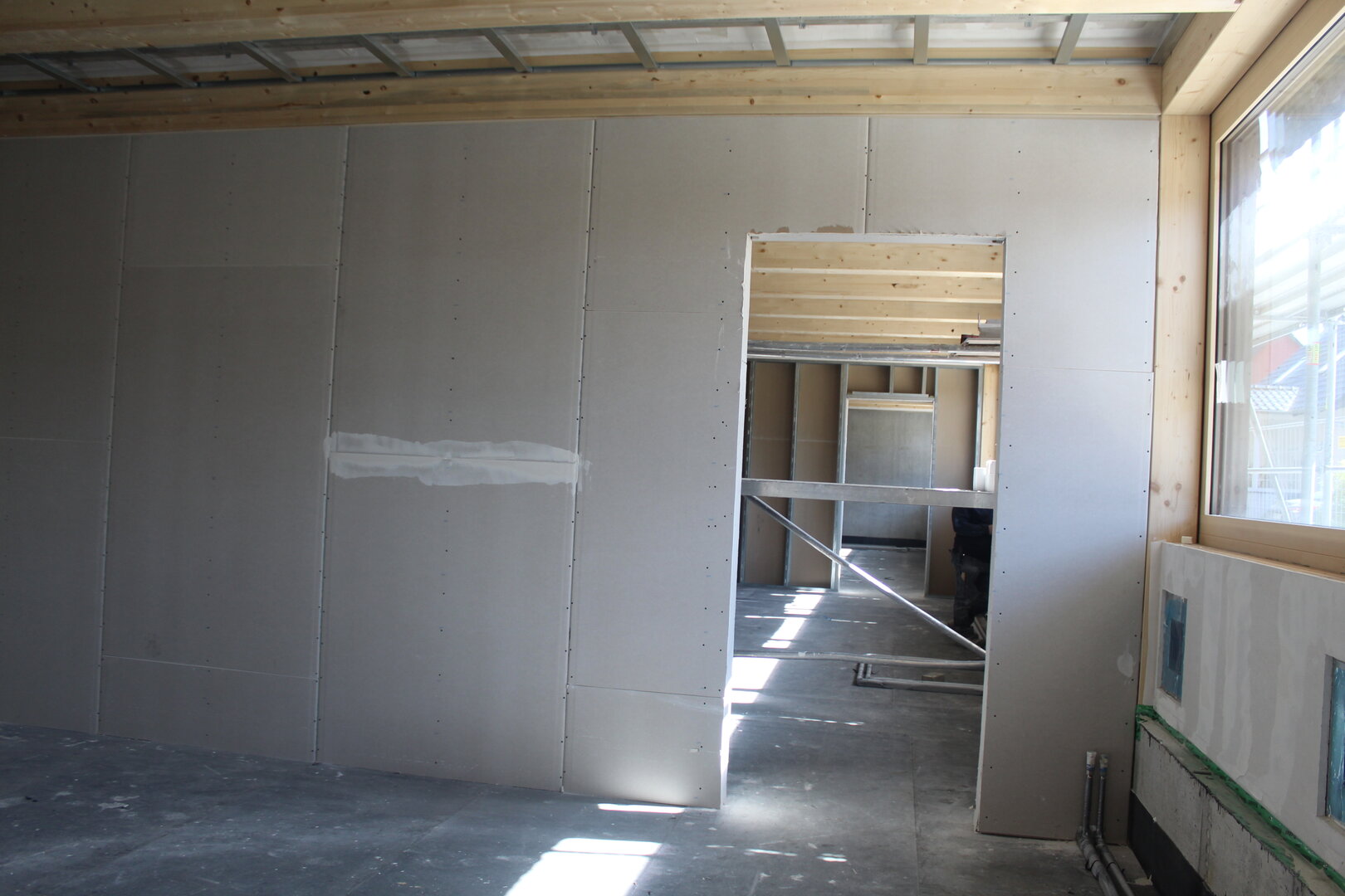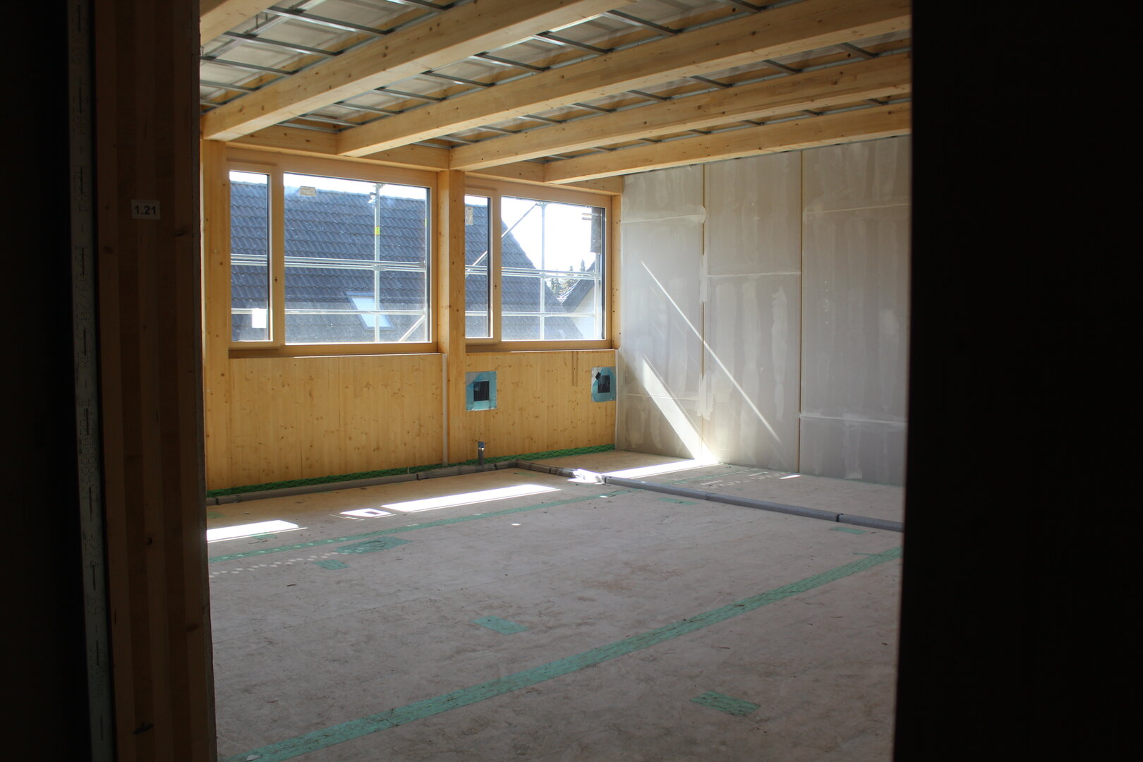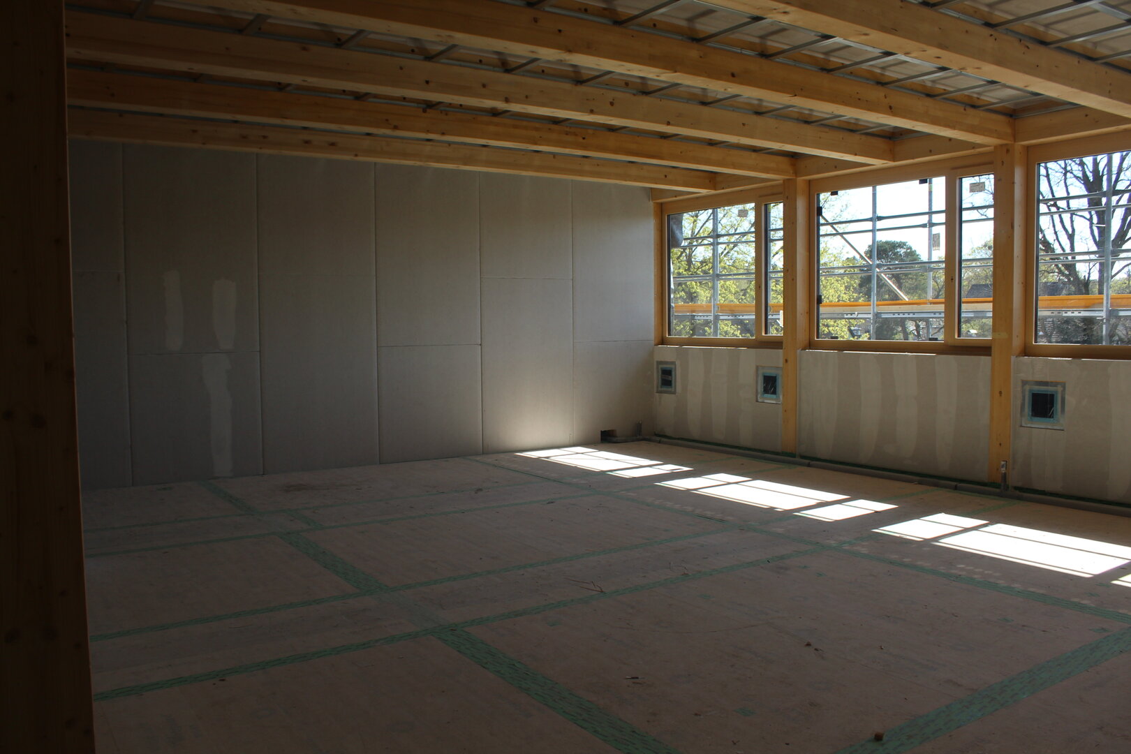 Endlich ist es soweit. Heute wurde der Kran abgebaut. Unser Anbau hat seine erforderliche Höhe erreicht und der Innenausbau geht in die nächste Runde. Fenster sind bereits eingebaut und langsam lässt sich erkennen, wie es von außen aussehen wird.