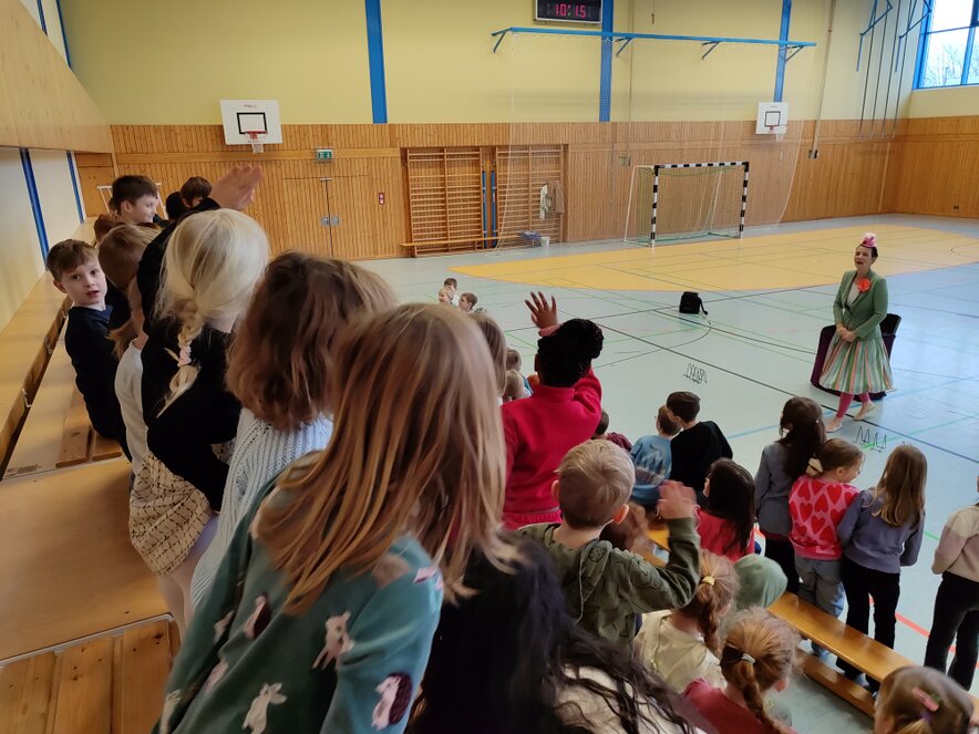 Hier zeigen alle Kinder der 3. Klassen in der Turnhalle, was sie können.